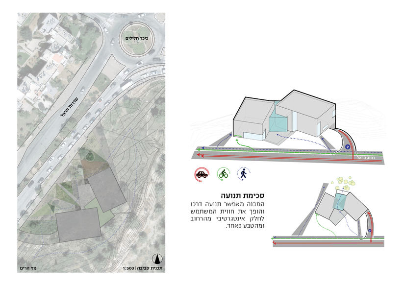 The structure, which is composed of two main masses, combines elements that preserve the natural and city connections, such as the passages that cross the building and the visual angles that maintain eye contact between the "city" and nature.